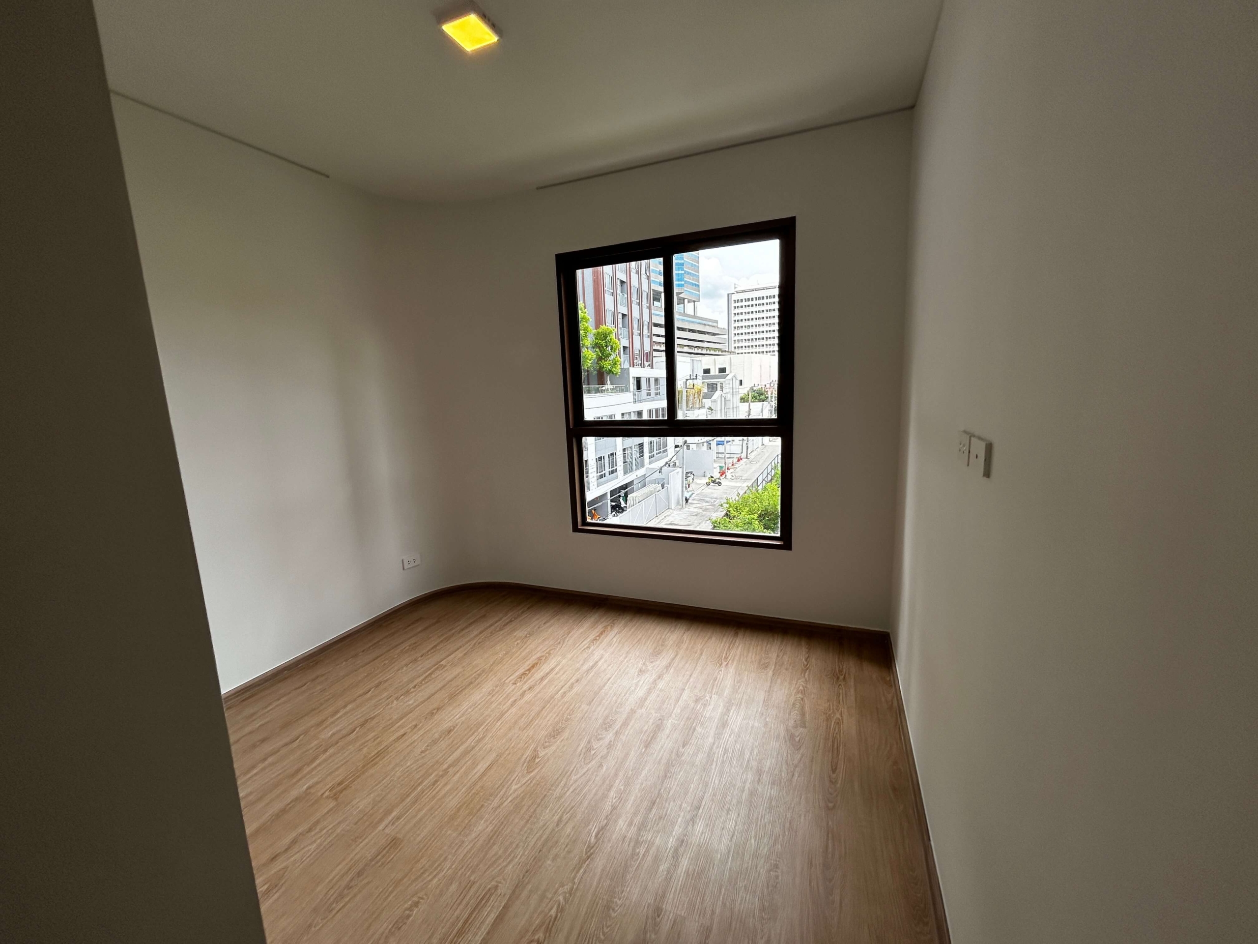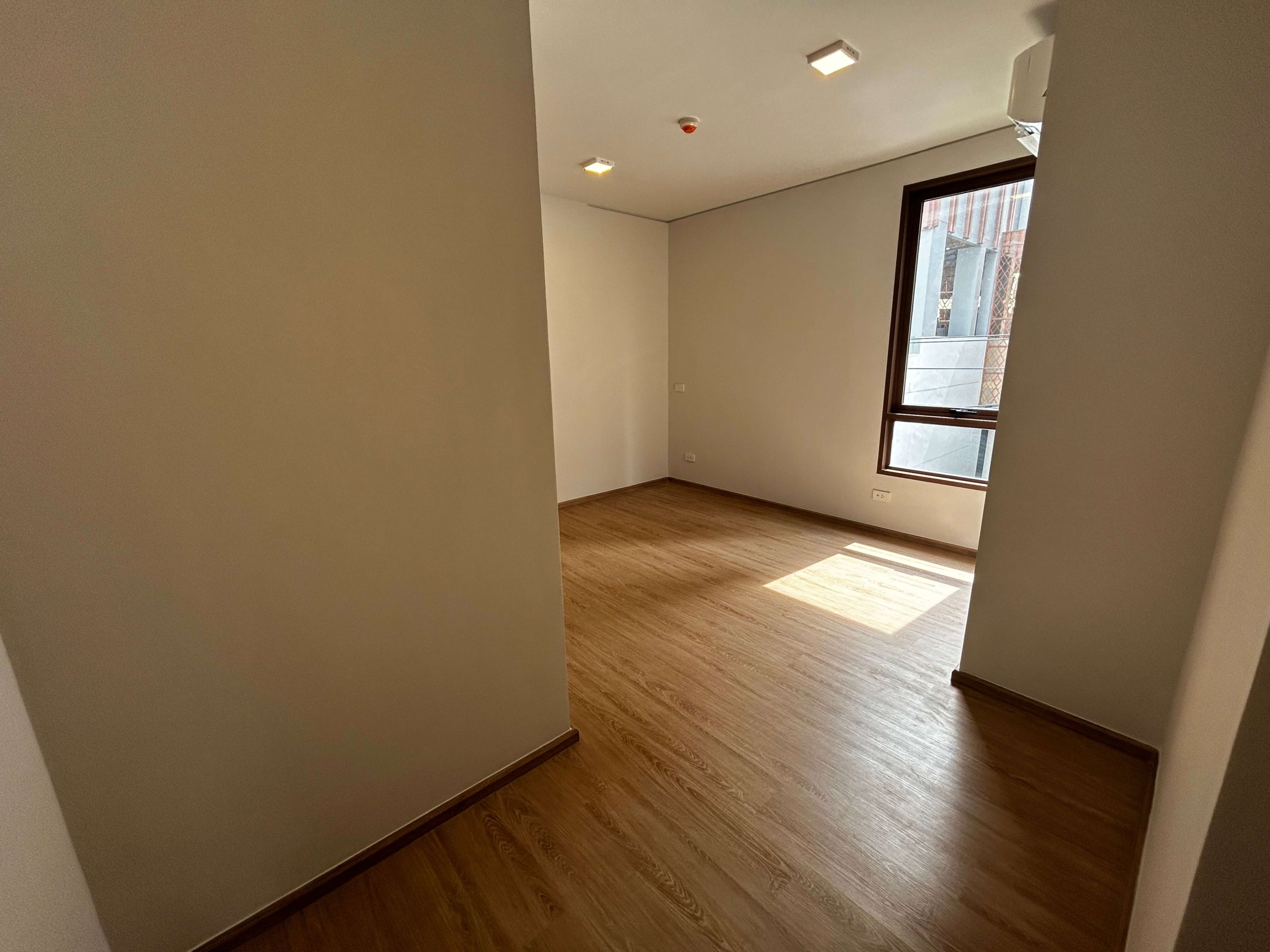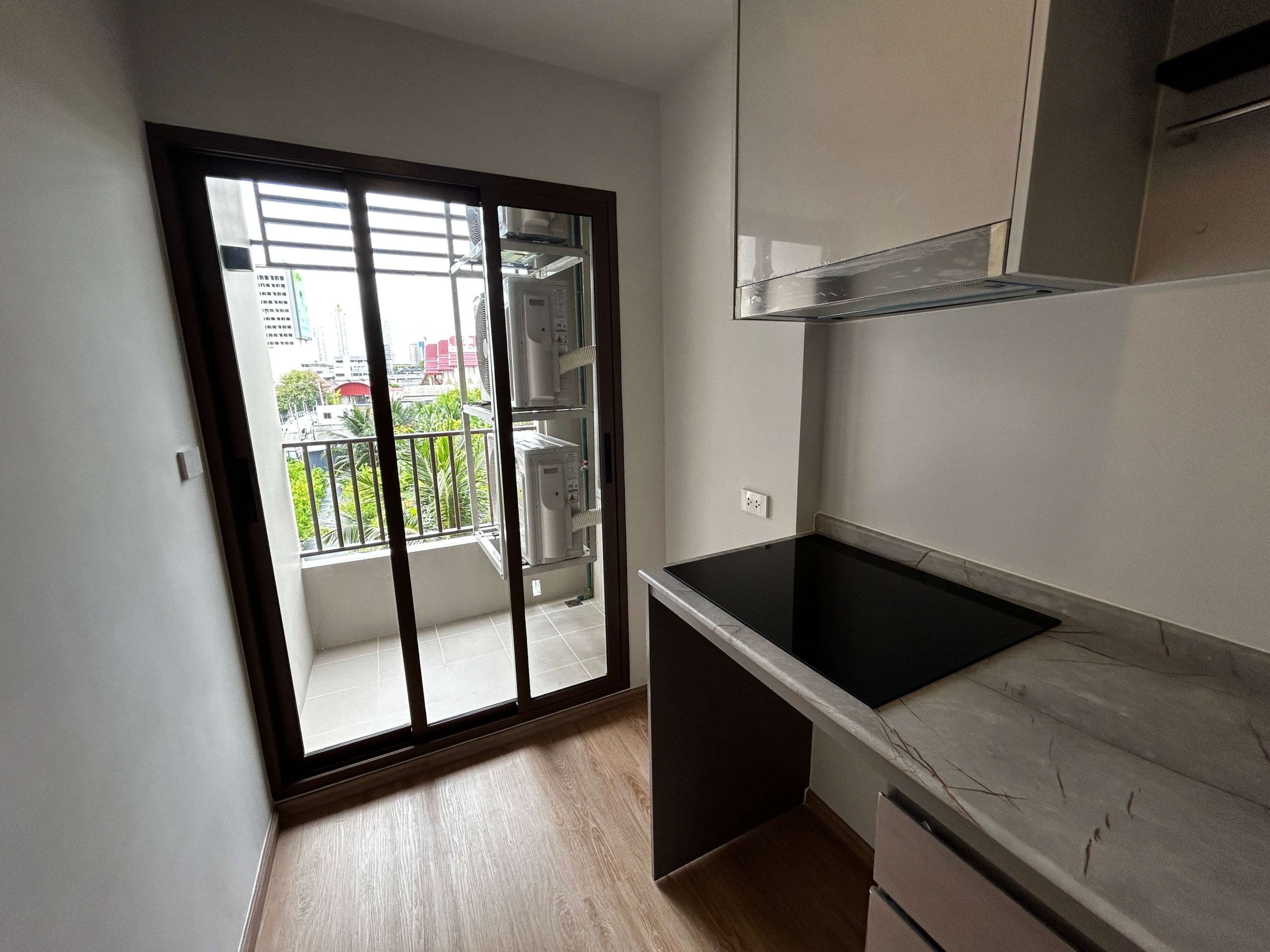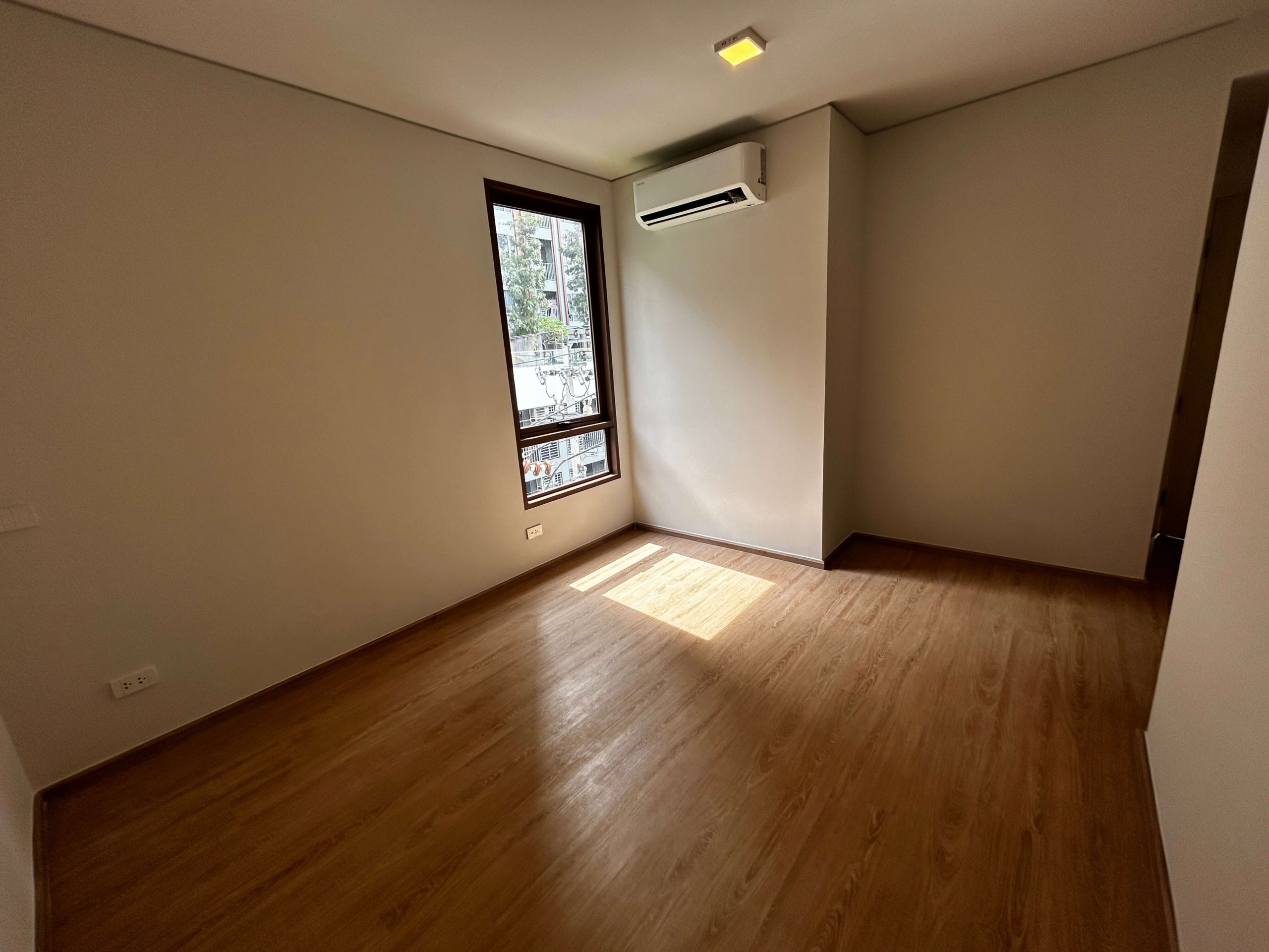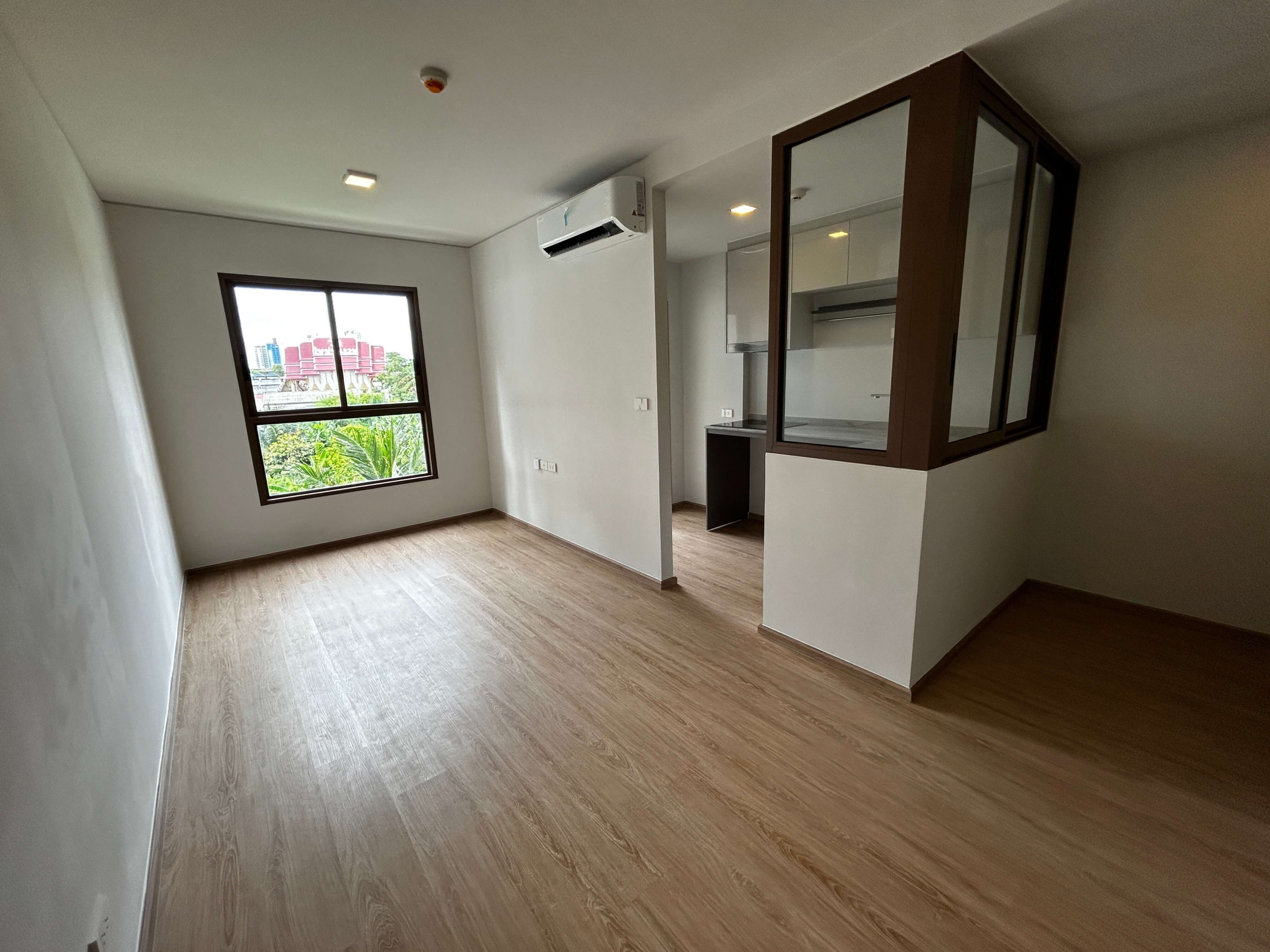 The room has air conditioning, a kitchen, a bathroom, smooth plaster walls and a complete set of furniture.