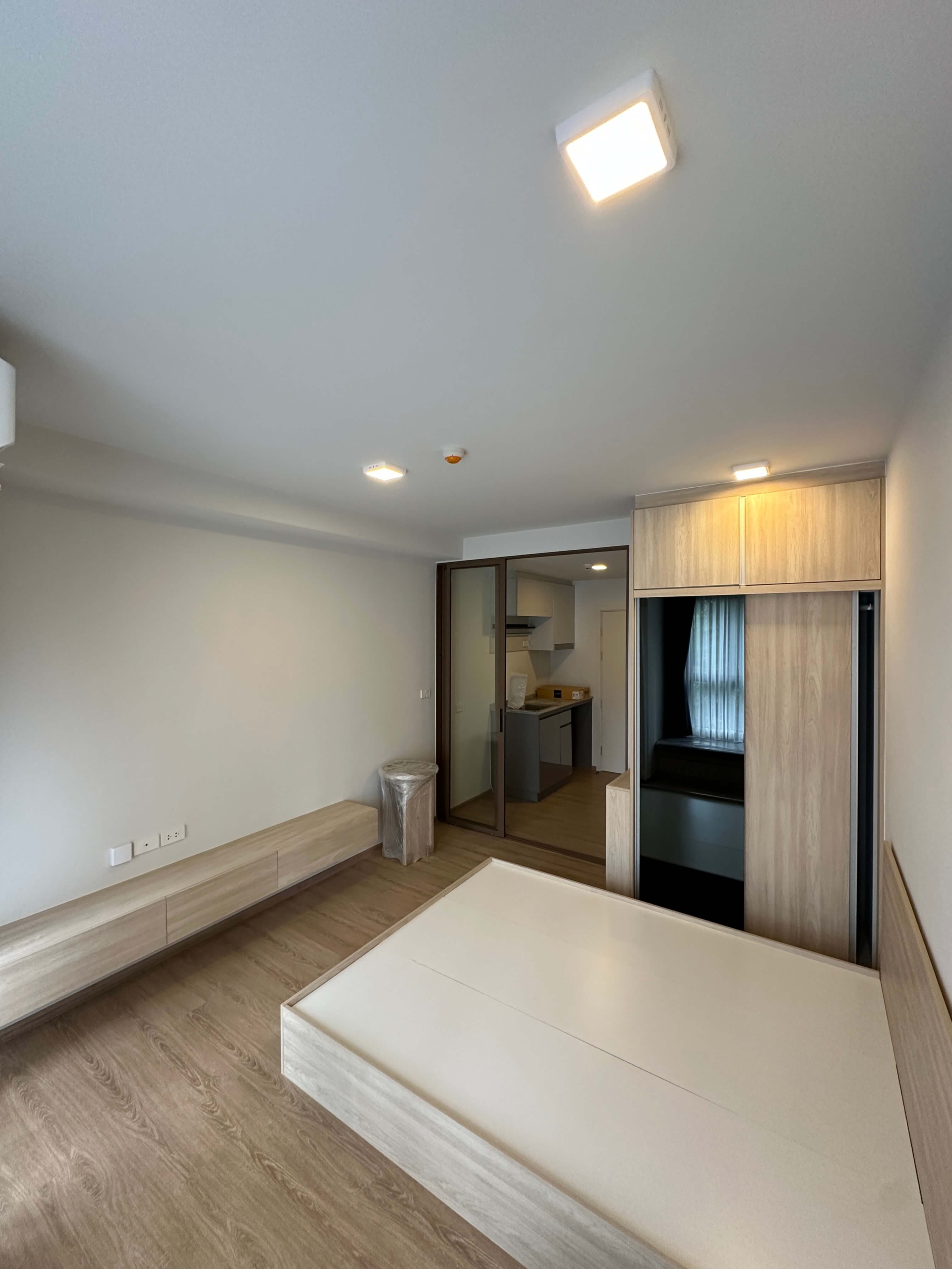 The room has air conditioning, a kitchen, a bathroom, smooth plaster walls and a complete set of furniture.