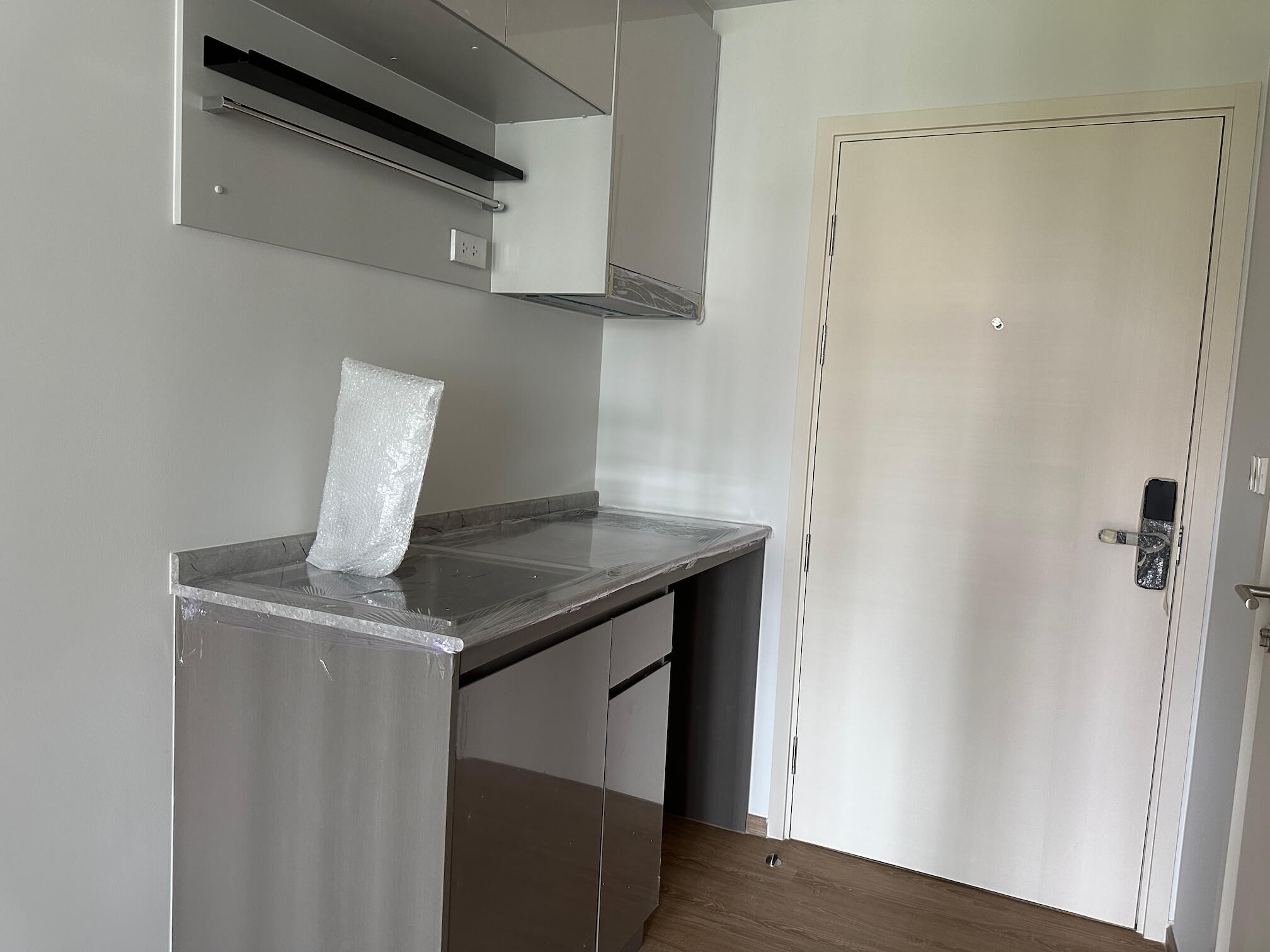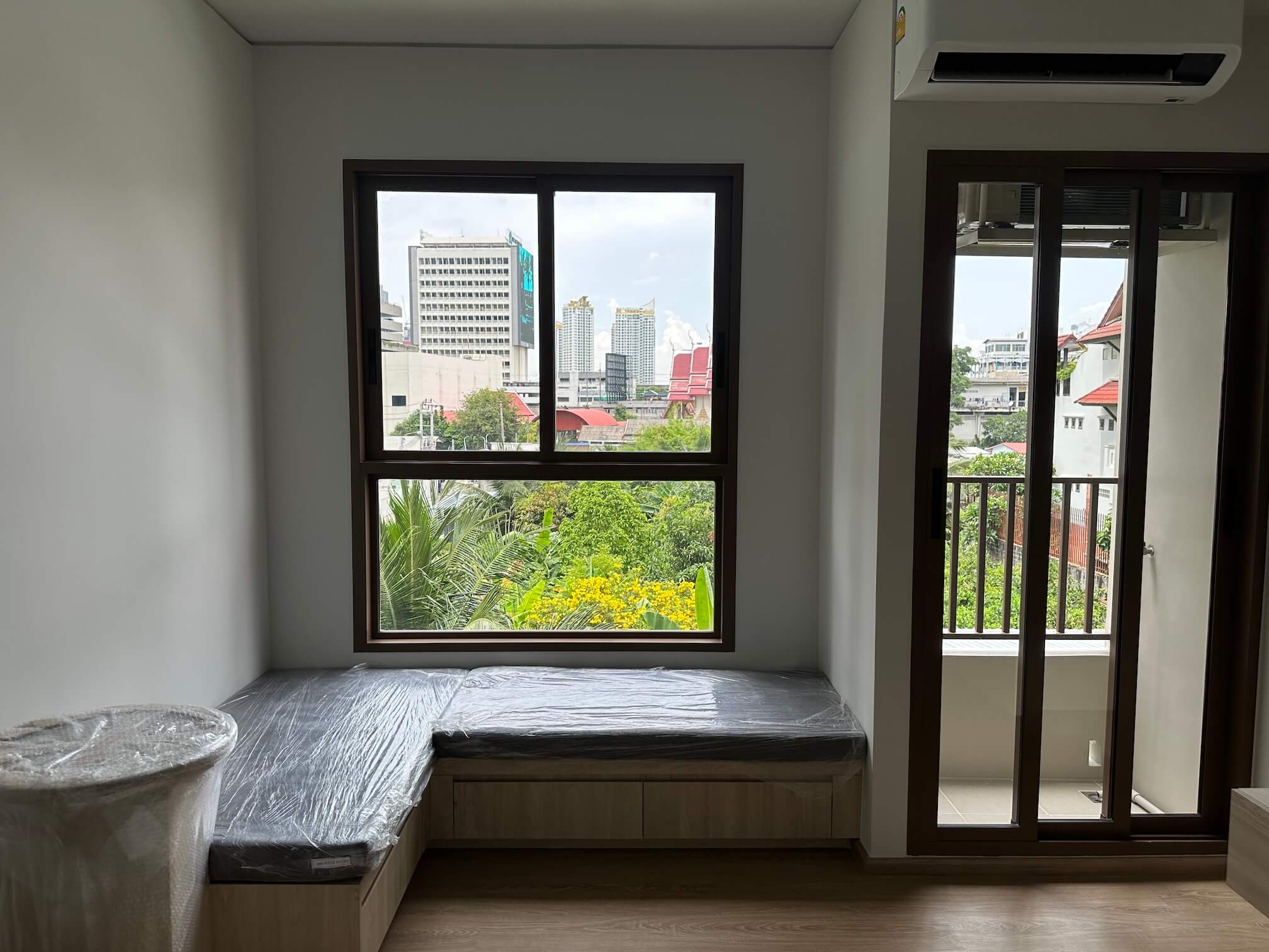 The room has air conditioning, a kitchen, a bathroom, smooth plaster walls and a complete set of furniture.